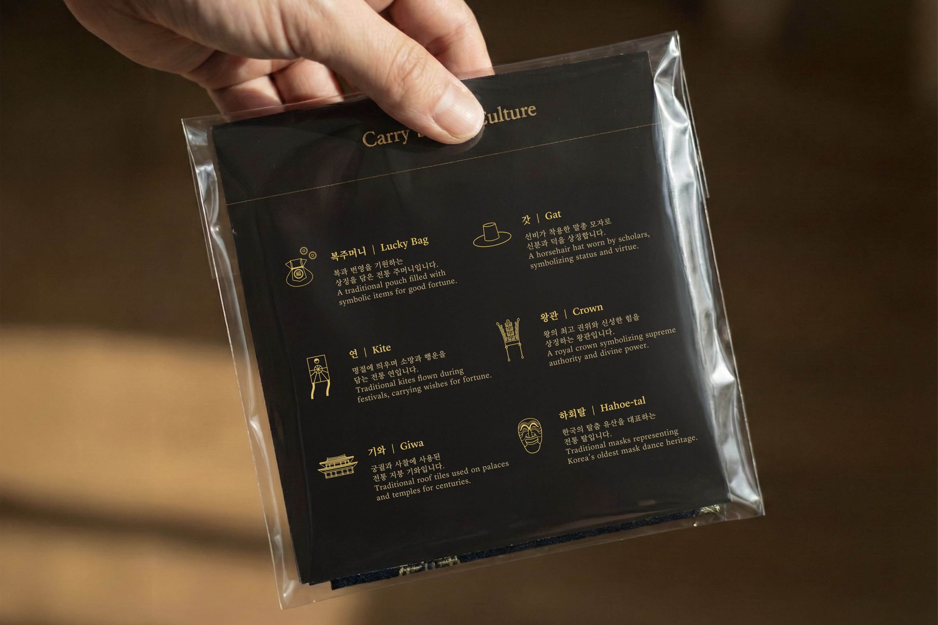 - 구성품: 오간자 파우치, 도자기 잔, 전통 책갈피, 커스텀 손수건, 금박 노트, 전통 스티커