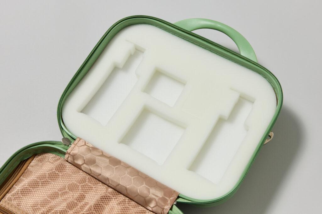 레디백은 튼튼한 폴리카보네이트 재질로 충격에 강한 특징을 가지고 있습니다. 하지만 내용물을 보다 안전하고 고급스럽게 담고 싶다면 스폰지 성형을 이용합니다. 담으려는 제품의 모양에 딱 맞춘 전용 스폰지를 레디백 내부에 끼우는 방식입니다. 유리나 아크릴 등 깨지기 쉬운 내용물도 안전하게 담을 수 있습니다.